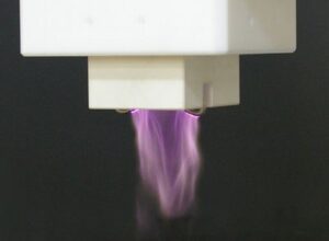 開発事例 コロナ放電装置 2024.03.27 紫色のフレアがコロナ放電の様子であり、電極間に高い電圧をかけることにより空気中に放電させているものです。 この装置では通常のエアーポンプを接続して空気を送り込んでいますが、酸素を供給する事で高濃度のオゾンを発生させることも可能です。